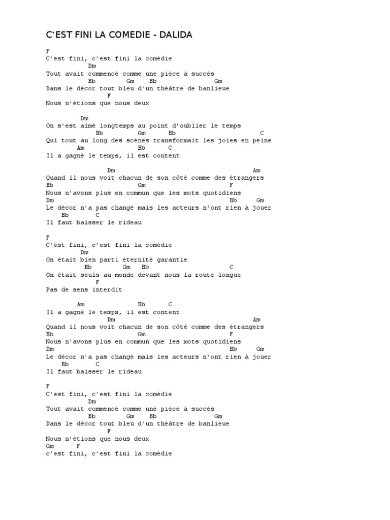 C est fini c est fini la comédie on était bien parti éternité garantie on était seuls au monde devant nous la route longue pas de sens interdit il a gagné le temps il est content quand il nous voit chacun de son côté comme des étrangers nous n avons plus en commun que les mots quotidiens. Français 478 allemand 45 anglais 22 egyptien 12 espagnol 16 flamand 2. Fini la comedie lyrics by dalida c est fini c est fini la comédie tout avait commencé comme une pièce à succès dans le décor tout bleu d un théâtre de banlieue nous n étions que nous deux on s est aimé longtemps au point d oublier le temps qui tout au long des scènes transformait les joies en peine il a gagné le temps il est content. C est fini c est fini la comédie tout avait commencé comme une pièce à succès dans le décor tout bleu d un théâtre de banlieue nous n étion.