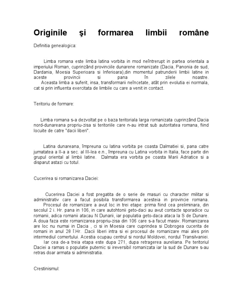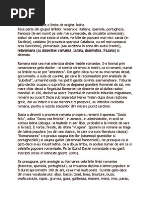 Latinalatina era limba vorbita in regiunea din jurul romei numita lazio. Limba română provine din latina populară vorbită sau latina vulgară lat. Peste îmbinarea dintre latina vulgară şi limba geto dacilor se suprapune contactul prelungit cu populaţiile slave care este considerat a sta la originea unei părţi. Luând în considerare teoria oficială potrivit căreia limba română provine din latina vorbită şi geto dacă perioada de formare este considerată a fi cea cuprinsă între secolele iii î hr şi secolul a vi lea.