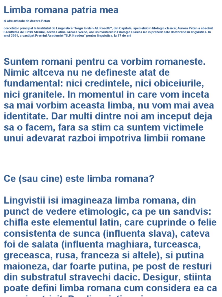 Cat la suta din limba romana este latina. Textul în limba latină va fi copiat automat în fereastra inferioară. A castigat o importanta majora ca si limba oficiala in imperiul roman toate limbile romanice provin de la latina mama si multe cuvinte bazate pe limba ltina sunt de gsit in alte limbi moderne ca engleza. Citește mai mult expresii latine cu traducere in limba romana. Limba si literatura romana si latina trimis de iuliacorlade la vin 09 06 2019 19 37 disciplina limba şi literatura română are un rol deosebit de important in formarea personalităţii elevilor în formarea unor deprinderi şi abilităţi necesare pentru a le asigura accesul postşcolar la învăţarea pe toata durata vieţii şi integrarea activă într o societate bazată pe cunoaştere.