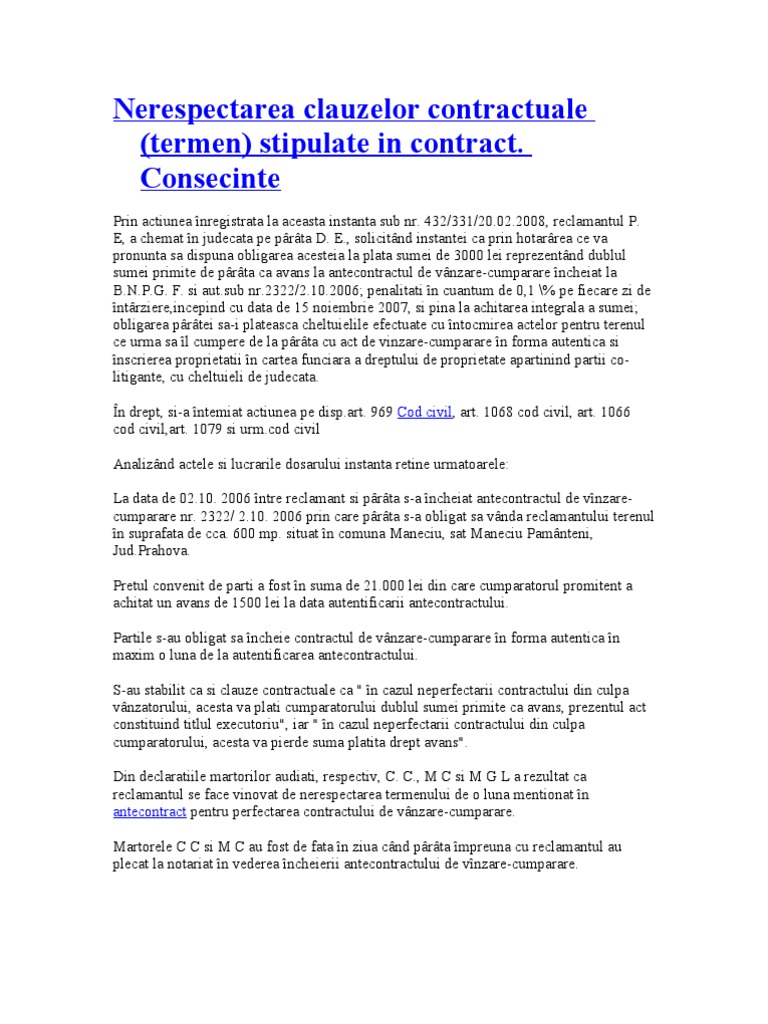 Antecontractul de vanzare cumparare poate inceta prin acordul partilor prin intervenirea prescriptiei dreptul de a obţine executarea obligaţiei asumate prin antecontract se prescrie în termen de 6 luni de la momentul la care contractul de vânzare cumpărare trebuia încheiat iar dreptul de a obţine rezoluţiunea antecontractului se prescrie în termenul general de prescripţie de 3 ani. în general nu prea se practică includerea unor clauze speciale în contract care să prevadă înapoierea avansului în cazul în care vânzarea imobilului nu mai are loc. Astfel la momentul încheierii antecontractului promitentul vânzător poate să nu deţină în proprietate bunul respectiv. Pe langa clauzele standard eu pierd avansul daca ma razgandesc ei imi dau dublul avansului daca se razgandesc in antecontract au fost trecute clauzele urmatoare.
