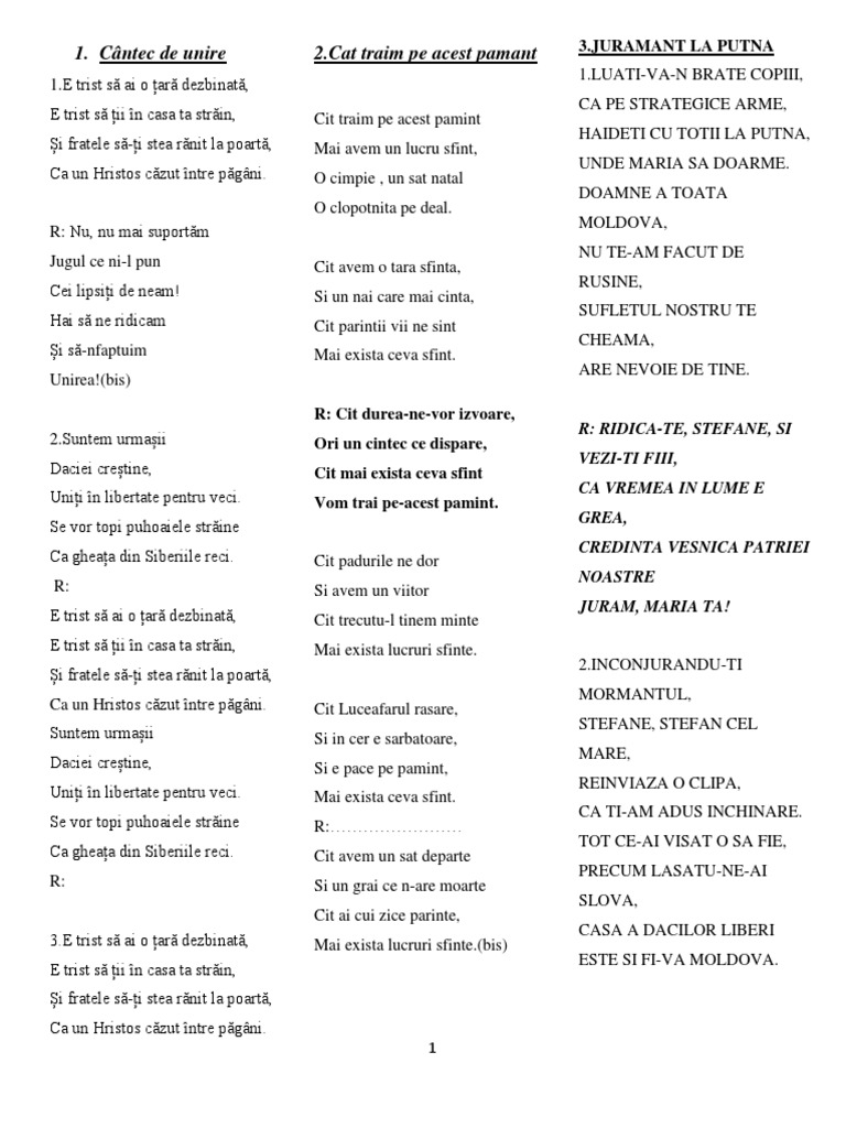Reactualizăm un cântec care a însoţit mişcarea de renaştere naţională din basarabia postbelcă 1988 1991 şi pe care mulţi dintre noi îl cunoaştem pe de rost l am cântat la mitinguri la cenacluri în spectacole de teatru şi muzică îl ţinem mereu în suflet şi la loc de cinste în fonoteca videoteca. Dm cât trăim pe acest pământ c mai avem un lucru sfânt c o câmpie un sat natal dm o clopotniţă pe deal cât avem o ţară sfântă şi un nai care mai cântă cât părinţii vii mai sunt mai există ceva sfânt refren. Cât pădurile ne dor mai avem un viitor cât trecutu l ținem minte mai există lucruri sfinte. Cât trăim pe acest pământ muzică.