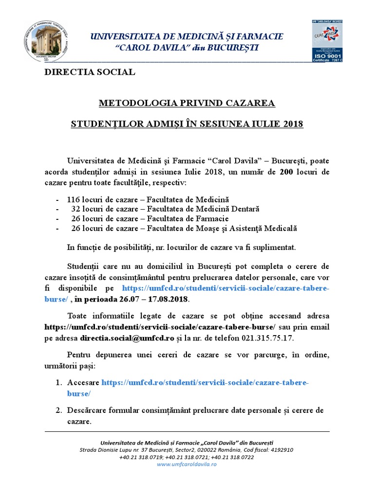 Solicitarea pentru obținerea avizului conducerii universităţii se depune prin intermediul postei electronice umf post univ umfcd ro în perioada 11 23 septembrie 2020. Anunț locuri transfer suplimentare locuri transfer documente necesare. Pentru anul universitar 2018 2019 universitatea de medicină şi farmacie carol davila bucureşti pune la dispoziţia studenţilor săi prin cele11 cămine studenţeşti dispuse în campus universitar regie şi grozăveşti 7 respectiv 3 în grozăveşti şi unul în p ţa rosseti un total de 3 224 locuri de cazare număr ce acoperă peste 90 din totalul solicitărilor depuse de. Cazarea studentilor in caminele umf carol davila bucuresti se face pe baza listelor de cazare vizate de prorectorul relatii cu studentii al umf carol davila bucuresti.
