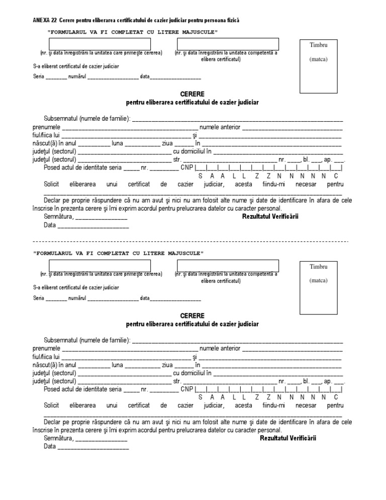 Cazier judiciar persoane fizice. In cazul persoanelor cu domiciliul in strainatate documentul se poate elibera in cel mult 30 de zile de la depunerea cererii. Informaţii utile cazier judiciar adeverințe de integritate comportamental. Mai jos poti citi despre fiecare dintre ele. Solicit eliberarea unui certificat de cazier judiciar acesta fiindu mi necesar pentru declar pe proprie răspundere că nu am avut şi nici nu am folosit alte nume şi date de identificare în afara de cele înscrise în prezenta cerere şi îmi exprim acordul pentru prelucrarea datelor cu caracter personal.