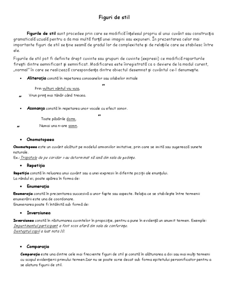 Ce înseamnă figuri de stil. Aliteratia este figura de stil care cobsta in repetitia unei consoabe sau a unyi grup de consoane cu scopul obtinerii unui efect imitativ armonic. Exemple de figuri de stil. Hiperbola este figura de stil prin care se exagerează proporțiile unor obiecte fenomene întâmplări pentru a mări expresivitatea. Prin aceste mijloace se urmareste obtinerea de sensuri noi figurate sau.