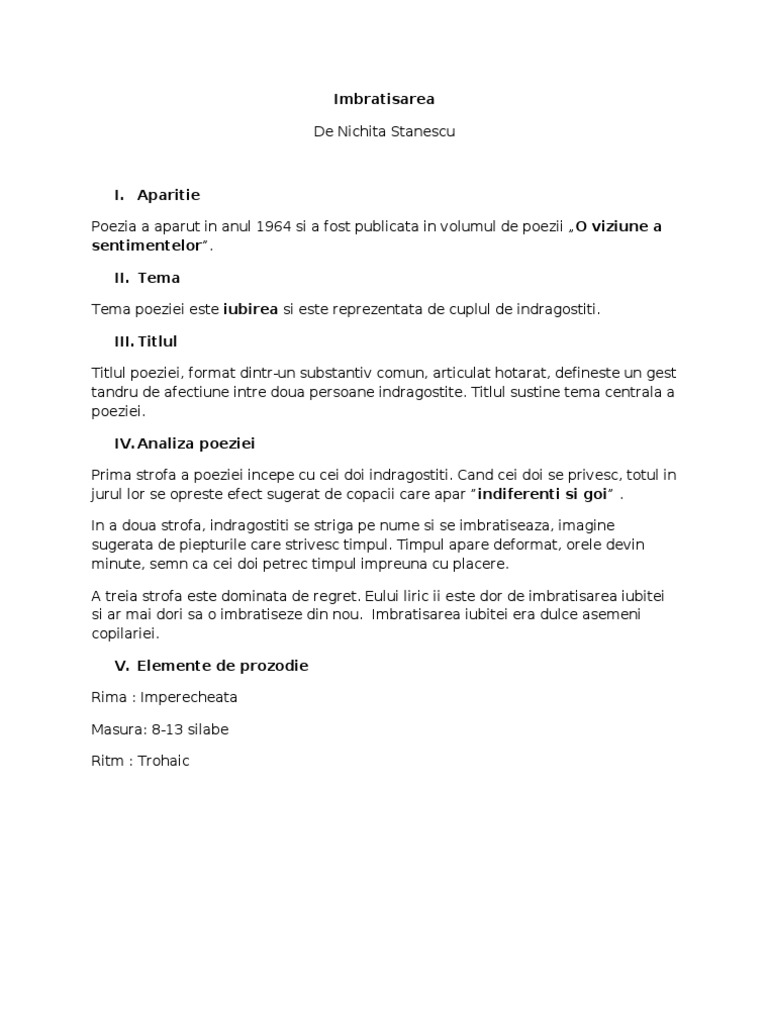 Ce bine ca esti nichita stanescu comentariu. Ce bine ca esti nichita stanescu e o întâmplare a fiinţei mele şi atunci fericirea dinlăuntrul meu e mai puternică decât mine decât oasele mele pe care mi le scrâşneşti într o îmbrăţişare mereu dureroasă minunată mereu. Să stam de vorba să vorbim să spunem cuvinte lungi sticloase ca niste dalti ce despart. Nichita stănescu ce bine că esti e o întâmplare a fiintei mele si atunci fericirea dinlauntrul meu e mai puternica decât mine decât oasele mele pe care mi le scrisnesti intr o imbratisare mereu dureroasa minunata mereu. Doua cântece diferite lovindu se amestecindu se doua culori ce nu s au vãzut niciodata una foarte de jos intoarsa spre pãmânt una foarte de sus aproape rupta în infrigurata neasemuita lupta a minunii ca esti a ntimplarii ca sunt.
