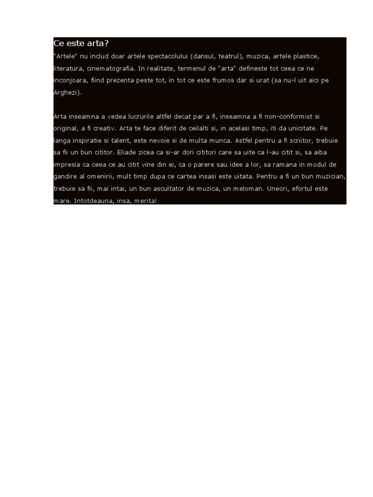 Arta este în esență cea mai profundă expresie a creativității umane pe cât de dificil de definit pe atât de dificil de evaluat având în vedere faptul că fiecare artist își alege singur regulile și parametrii de lucru se poate spune totuși că arta este rezultatul alegerii unui mediu a unui set de reguli pentru folosirea acestui mediu și a unui set de valori ce. Cei mai multi asociaza arta cu pictura. Arta insa este mai mult. Sunt multe definții ale artei de la arta este o expresie a imaginației nu o duplicare a realitații henry moore sculptor sau folosirea abilitaților și imaginației pentru a crea obiecte estetice medii sau experiențe care pot fi împărtașite altora dar cel mai mult mi a plăcut expresia pentru ca ceva să fie artă nu trebuie să aibă un scop în sine sau vreo funcționalitate.