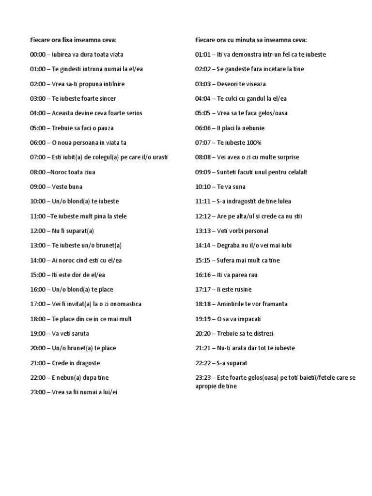 Fiecare ora fixa inseamna ceva 00 00 iubirea va dura toata viata01 00 te gindesti intruna numai la el ea02 00 vrea sa ti propuna intilnire03 00 te iubeste foarte sincer04 00 aceasta devine ceva foarte serios05 00 trebuie sa faci o pauza06 00 o noua persoana in viata ta07 00 esti iubit a de colegul a pe care il o urasti08 00 noroc toata ziua09 00 veste buna10 00. Ei bine oră fixă se referă de fapt la momentul în care privim ceasul atunci când numărul minutelor indică fix 00. Ora 09 00 dacă te întrebi ce înseamnă când te uiţi la ora 9 fix atunci trebuie să ştii că ai toate şansele să primești o veste bună din partea unui bărbat. Ce vrea să spună asta ce.
