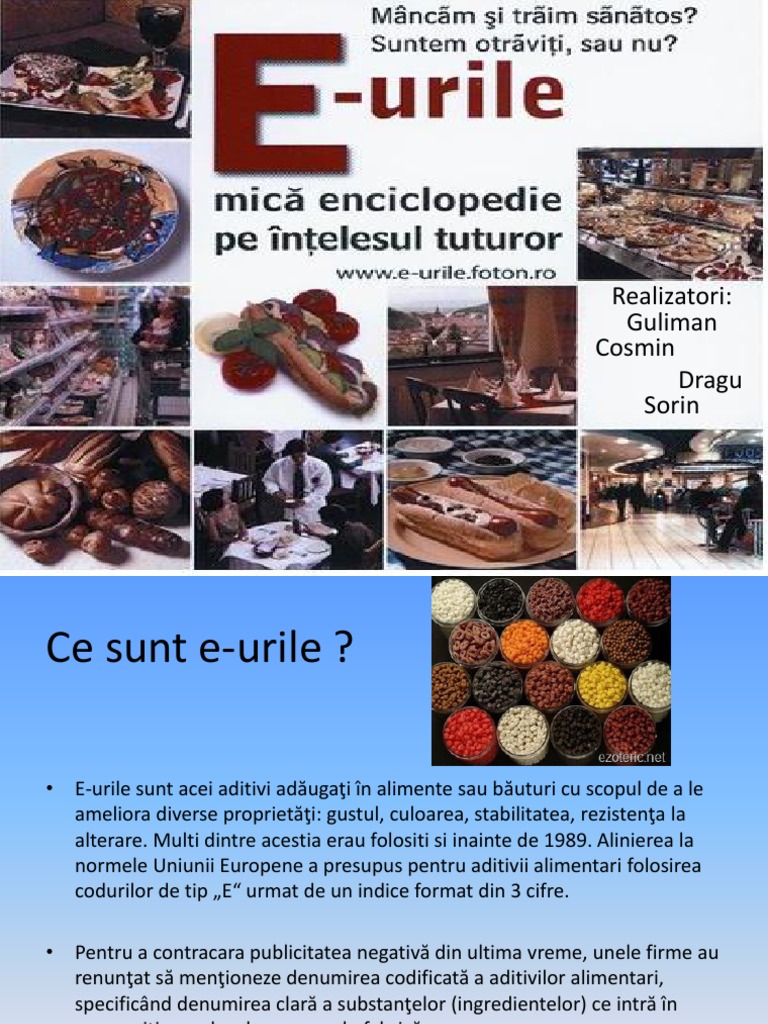 Ce sunt e urile. E uri bune e uri rele i aditivii alimentari sunt cunoscuti sub denumirea codificata de e uri. Multi dintre acestia erau folositi si inainte de 1989. Produsele alimentare sunt si ele obtinute astazi cu ajutorul celor mai noi procedee. Tehnologia este prezenta in aproape toate mediile.