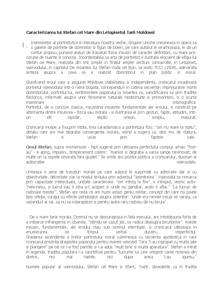 Ce trasatura fizica a domnitorului stefan cel mare se remarca in ambele portrete. In cel de al treilea paragraf ureche vrea sa scoata in evidenta cat de mult l au iubit locuitorii moldovei pe domnitorul lor l au ingropat tara cu multa jale si multa plangere in manastire in putna care era de dansul zidita. Aparator al poporului dar si bizuindu se el pe prostime in opera istorica a lui nicolae iorga portretul lui stefan cel mare pune in lumina insusirile omului politic ctitorul unui stat. In cel de al treilea paragraf ureche vrea sa scoata in evidenta cat de mult l au iubit locuitorii moldovei pe domnitorul lor l au ingropat tara cu multa jale si multa plangere in manastire in putna care era de dansul zidita. De la singura trasatura fizica folosita de autor in acest portret statura s a nascut calificativul cel mare devenind legendar ca insasi persoana.