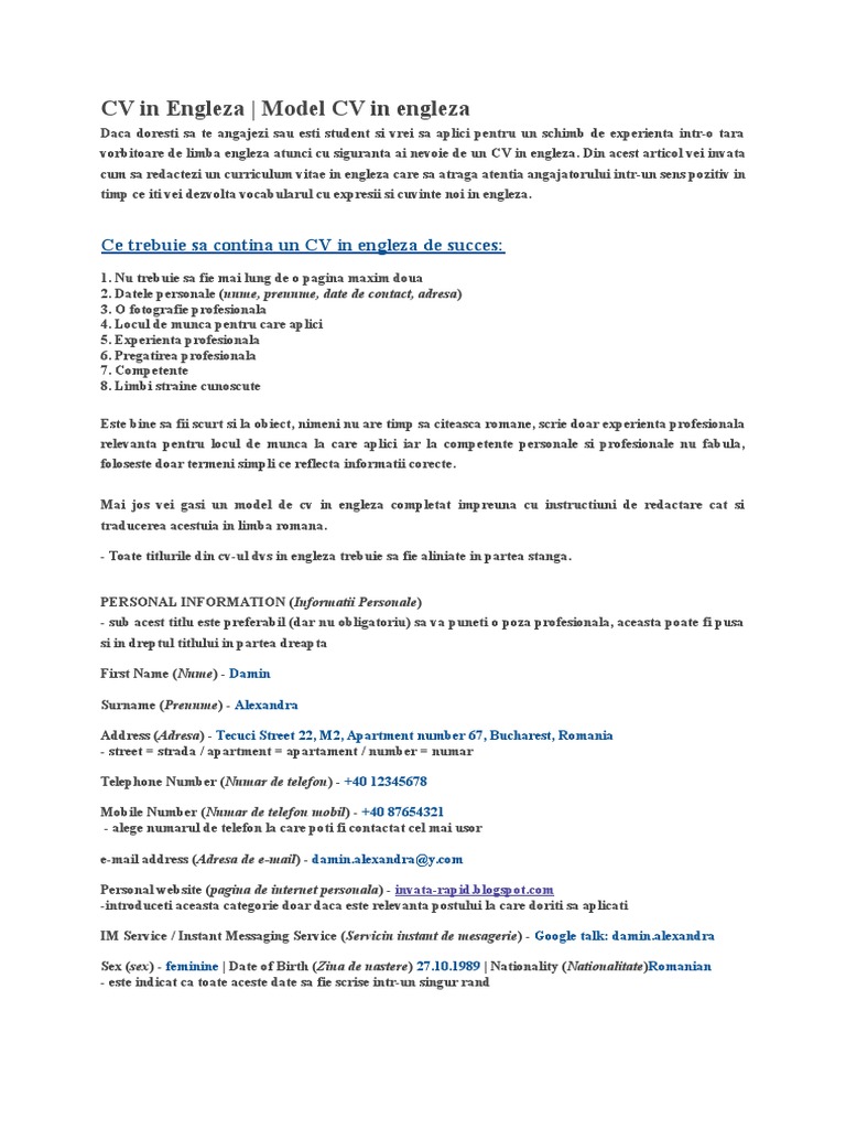 Un cv trebuie sa contina urmatoarele date personale adica. Pentru asta ai nevoie de un model cv 2020 acel exemplu care te îndrumă ce să scrii la fiecare categorie și ce aptitudini cv să pui în valoare pentru a ți găsi mai ușor un loc de muncă. In general documentul nu trebuie sa contina mai mult de doua pagini. Acesta trebuie sa fie cursiv si coerent si foarte important nu trebuie sa contina greseli gramaticale sau de ortografie.