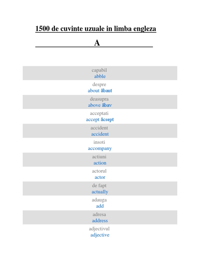 Dupa ce ai invatat cuvinte in engleza si cum trebuie sa le folosesti iti recomand sa citesti foarte multe carti in limba engleza. Cand te uiti la numarul mare de omofone cuvinte ce se pronunta la fel dar se scriu diferit. A un able capabil. Lecturi articole pentru imbunatatirea vocabularului limba engleza.