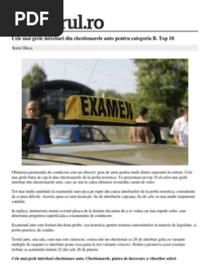 Chestionareauto ro a selectat pentru tine cele mai grele intrebari de la examen iar in fiecare zi iti pune la dispozitie un set de 26 de intrebari din categoria b pe care le poti parcurge de atatea ori cat e nevoie pana le rezolvi pe toate si pana le intelegi pe toate. Am reusit sa cream un top cu cele mai deapreciate 5 intrebari votate de catre utilizatori care au fost votate in cele mai multe chestionare auto de pe site. Toggle navigation drpciv teste ro testele mele 0. Chestionare auto la care primesti explicatia corecta pentru fiecare raspuns gresit.