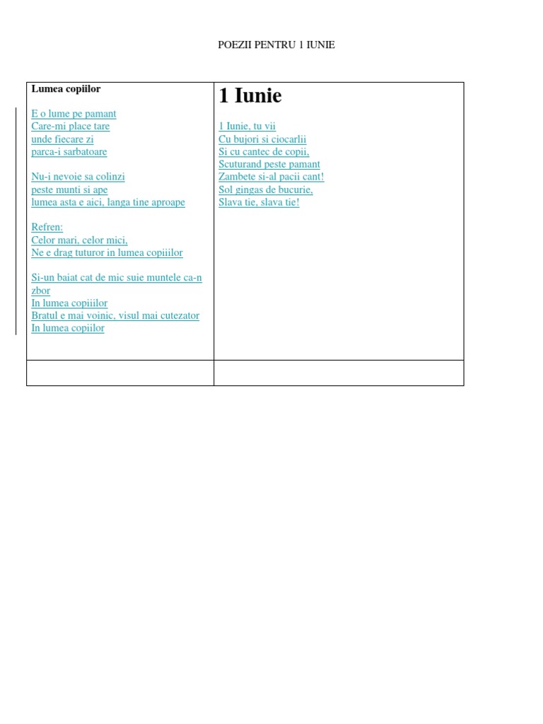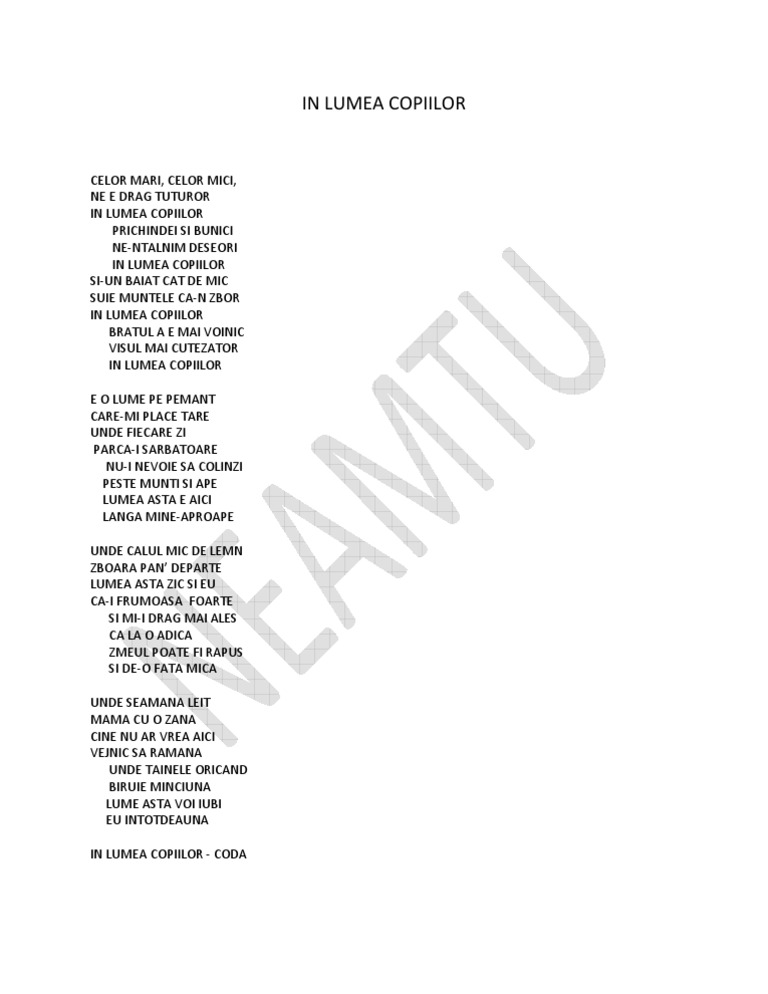 Celor mari celor mici ne e drag tuturor in lumea copiilor cantec. Copilăria nu o vom uita. Celor mari celor mici ne e drag tuturor in lumea copiilor prichindei si bunici ne ntalnim deseori in lumea copiilor si un baiat cat de mic suie muntele ca n zbor in lumea copiilor bratul e mai voinic visul mai cutezator in lumea copiilor. Dragi copii din lumea ntreagă flori albastre mândre flori toate gândurile noastre se îndreaptă către voi. Copilăria n o vom uita nu ne mai întâlnim.