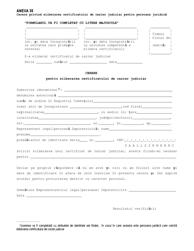 Cerere cazier judiciar persoana juridica. Cerere privind eliberarea certificatului de cazier judiciar pentru persoana. Solicit eliberarea unui certificat de cazier judiciar. Solicit eliberarea unui certificat de cazier judiciar acesta fiindu mi necesar pentru declar pe proprie r ăspundere c ă nu am avut şi nici nu am folosit alte nume şi date de identificare în afara de cele înscrise în prezenta cerere şi îmi exprim. Motivul solicitării certificatului de cazier judiciar este subsemnatul declar pe proprie răspundere că denumirea 2 nu a avut şi nici nu a folosit alte denumiri şi atribute de identificare în afară de cele înscrise în prezenta cerere.