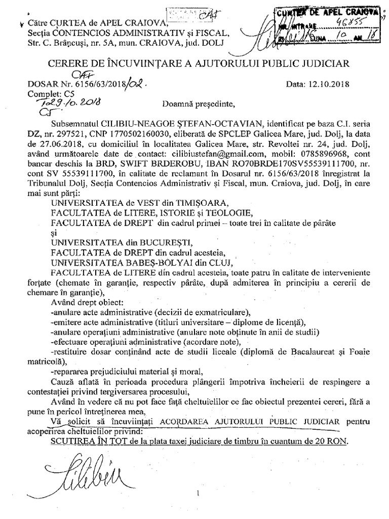 Cerere de ajutor public judiciar. Art 43 din oug 195 2002 3 asupra cererii de acordare a facilitatilor la plata taxei de timbru instanta se pronunta fara citare prin incheiere motivata data in camera de consiliu. Vă aducem la cunoştinţă faptul că dacă instanţa constată că cererea de ajutor public judiciar a fost făcută cu rea credinţă prin ascunderea adevărului va obliga prin încheiere pe cel care a beneficiat nejustificat de ajutor public judiciar la restituirea cu titlu de despăgubire a sumelor de care a fost scutit precum şi la o amendă în cuantum de până la 5 ori suma. Dacă instanţa constată că cererea de ajutor public judiciar a fost făcută cu rea credinţă prin ascunderea adevărului va obliga prin încheiere pe cel care a beneficiat nejustificat de ajutor public judiciar la restituirea cu titlu de despăgubire a sumelor de care a fost scutit precum şi la o amendă în cuantum de până la 5 ori suma pentru care a obţinut nejustificat scutirea. Obligaţia de a declara de îndată autorităţii competente să soluţioneze cererea orice schimbări survenite în situaţia mea financiară.