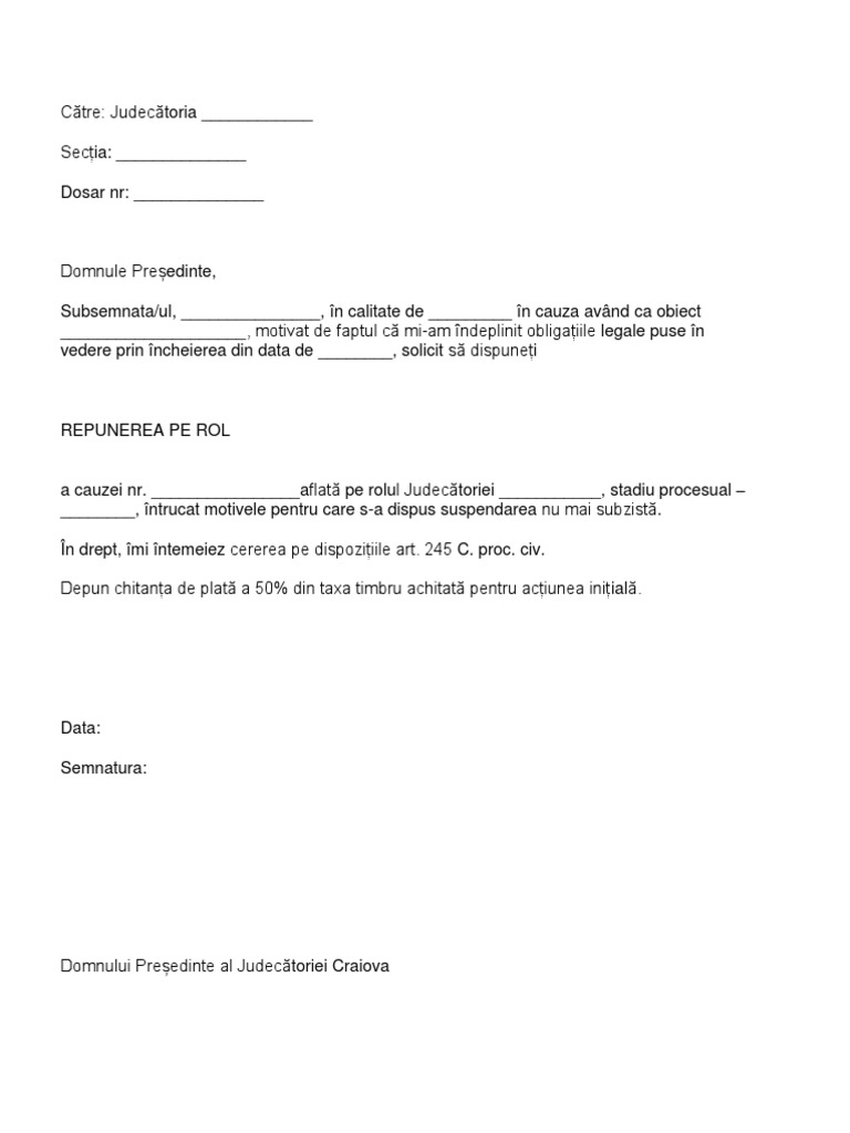 Cerere de chemare in judecata. In fapt aratam ca prin incheierea de sedinta pronuntata la data de. Un model de cerere de repunere pe rol dupa suspendarea ordinului de protectie conf art 242c pr. Cerere repunere pe rol.
