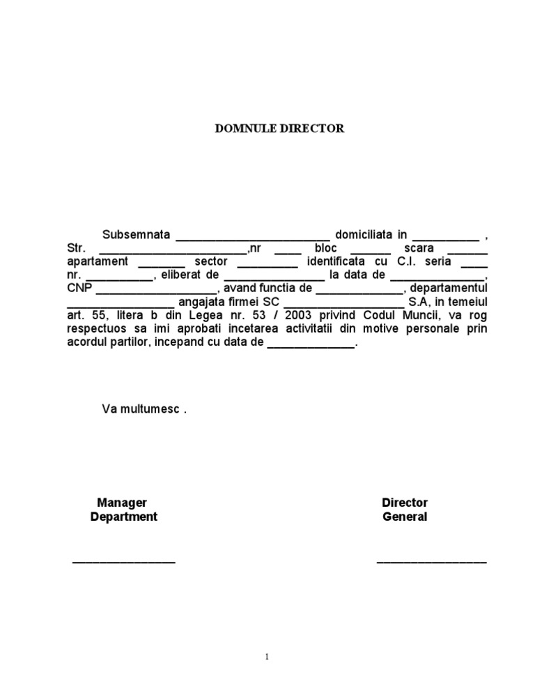 Solicită încetarea contractului individual de muncă prin acordul părţilor şi ţinând seama de aprobarea acestei cereri. Află totul despre demisie în codul muncii găseste raspunsuri la întrebările frecvente și descarcă modelul instant cu și fară preaviz. 1 începând cu data de încetează contractul individual de muncă al d lui d nei având. B din codul muncii şi este o modalitate simplă şi rapidă de a înceta un contract de muncă.