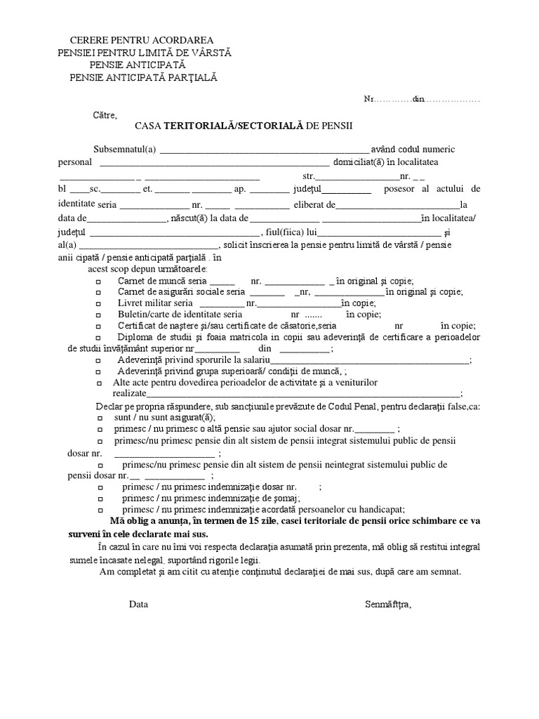 Cerere privind eliberarea buletinului de calcul și a celorlalte documente care au stat la baza emiterii deciziei de pensie. Cerere tip pentru inscrierea la pensie de urmas. Cerere pentru acordarea pensiei de limita de varsta pensiei anticipate pensiei anticipata partiala. 263 2010 privind sistemul unitar de pensii publice este principala categorie de pensie acordată în românia.