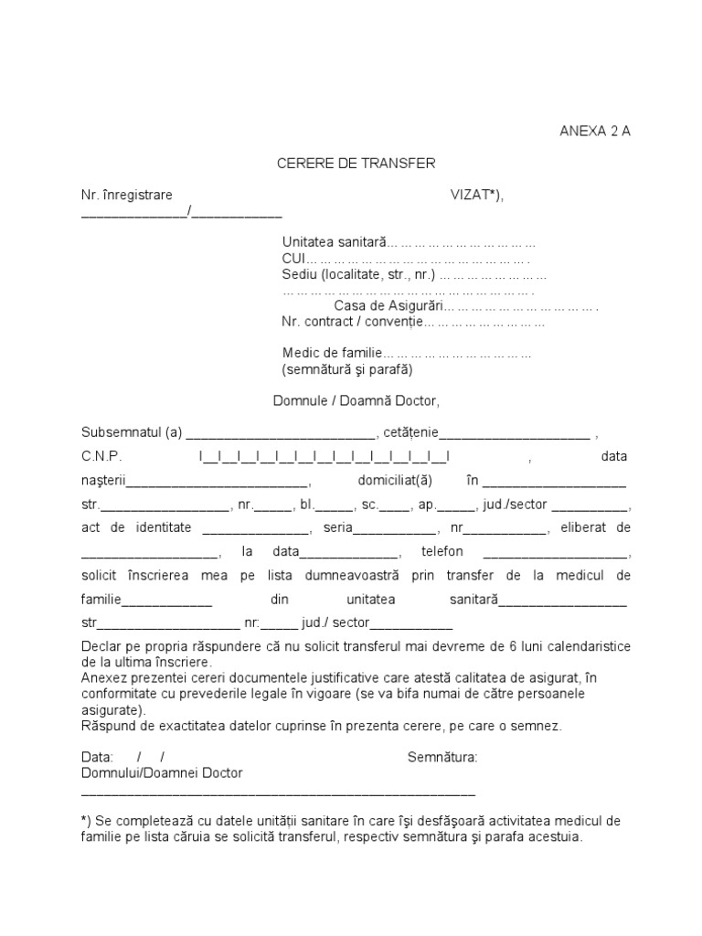 Cerere transfer medic de familie 2018. Depuneţi cererea la medicul de familie dacă vă înregistraţi pentru prima dată sau schimbaţi medicul în cadrul aceleiaşi instituţii medicale. Că nu sunt înscris ă pe lista unui medic de familie. Completaţi următorul model de cerere. Solicit înscrierea mai devreme de 6 luni calendaristice de la ultima înscriere deoarece.