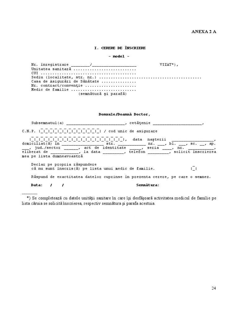 De la ultima înscriere. Cerere inscriere transfer medic de familie 01 04 2018 anexa 2a pdf pachet servicii asistenta primara si conditii acordare 01 07 2019 anexa1 pdf pachet servicii preventive copii adulti asimptomatici 01 04 2018 anexa 2b pdf. Răspund de exactitatea datelor cuprinse în prezenta cerere pe care o semnez. A survenit decesul medicului pe lista c ruia sunt înscris medicul de familie nu se mai afl în rela ie contractual cu casa de asigur ri de s n tate.