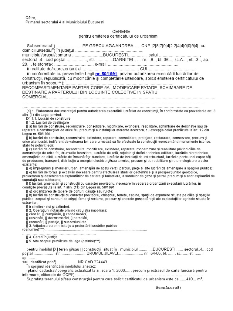 Eliberarea certificatului de urbanism pentru schimbarea destinaţiei de către autoritatea locală primăria întocmirea proiectului de arhitectură conform certificatului de urbanism eliberat obţinerea acordurilor şi avizelor necesare avizarea documentaţie tehnice de către oficiul de cadastru şi publicitate imobiliară. 3 din legea nr. Buna ziua pentru a schimba destinatia unor spatii existente fara realizarea altor modificari sau lucrari de constructie este nevoie doar de eliberarea certificatului de urbanism pe baza urmatoarelor documente. Pe el vreau sa construiesc o hala metalica de 200mp cu destinatie de spatiu comercial.