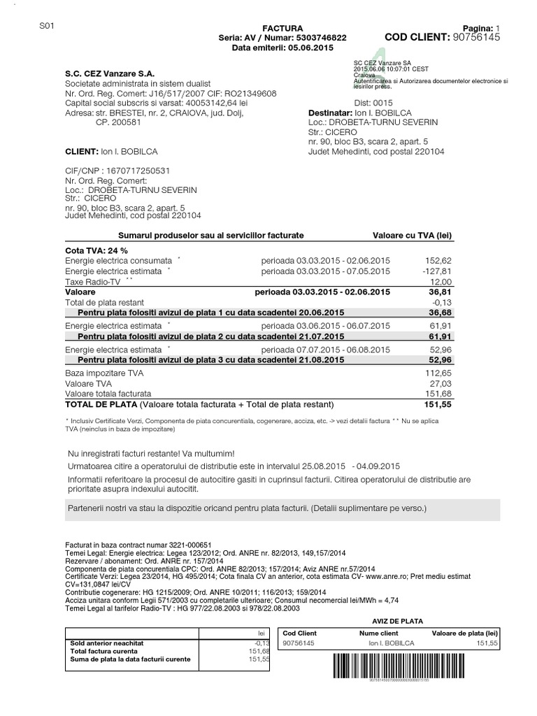 Informatiile de identificare ale clientului adresa locului de consum si adresa la care clientul primeste factura. 3 în cazul în care este obligatorie ajustarea bazei impozabile conform art. Pe prima pagina a facturii de energie electrica cez vanzare poti gasi in partea de sus a facturii.